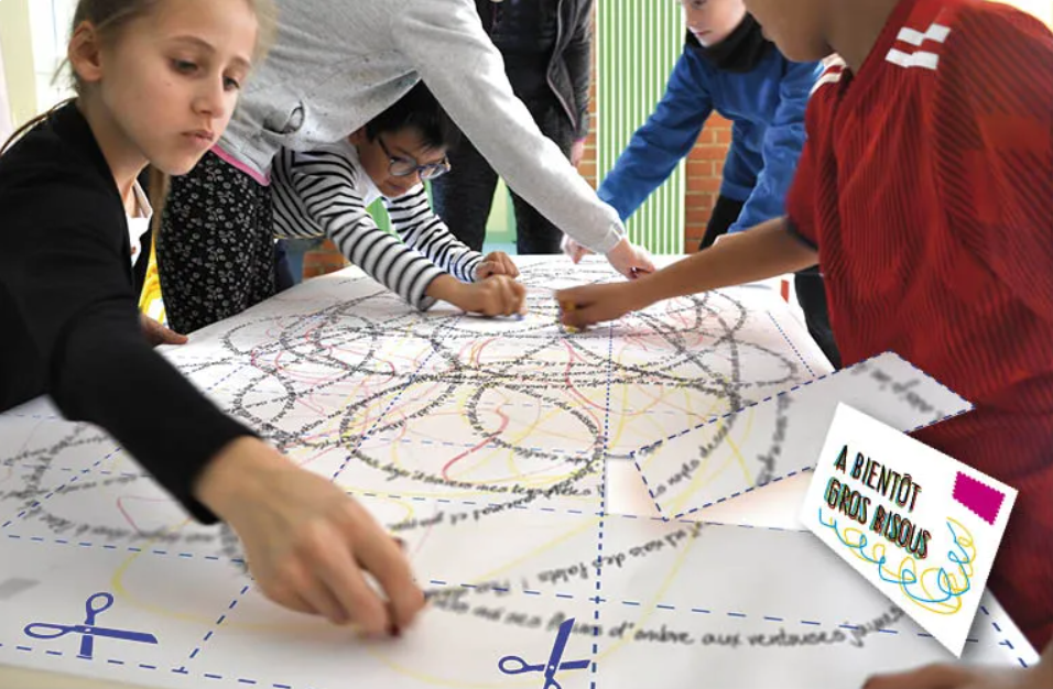 À partir de la lettre de Thomas Vinau (parrain 2026 d’École en poésie), chaque classe produit collectivement et coopérativement une carte postale poétique géante, la découpe et l’envoie à une autre classe qui reconstituera ce puzzle composé d'autant de cartes postales poétiques que d’élèves.