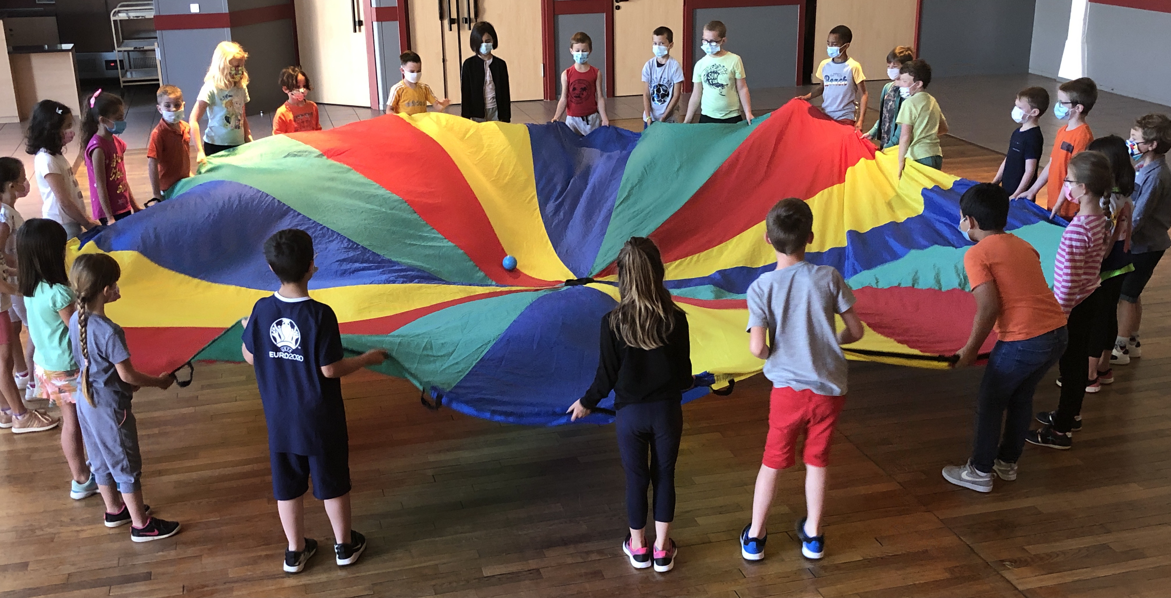 Grâce aux jeux de parachutes les élèves apprennent à se situer dans l’espace et à coopérer ; ils font preuve de créativité et de spontanéité. Ils utilisent un outil collectif, dans la poursuite d’un objectif commun, tout en respectant des règles simples.