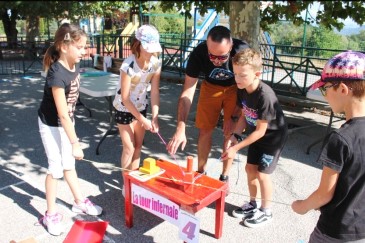 La tour infernale est un jeu de construction dans lequel les joueur.ses doivent se coordonner pour réaliser les modèles d'empilement proposés sans toucher les pièces avec les mains. Les enfants utilisent alors les ficelles pour se saisir de chaque pièce.