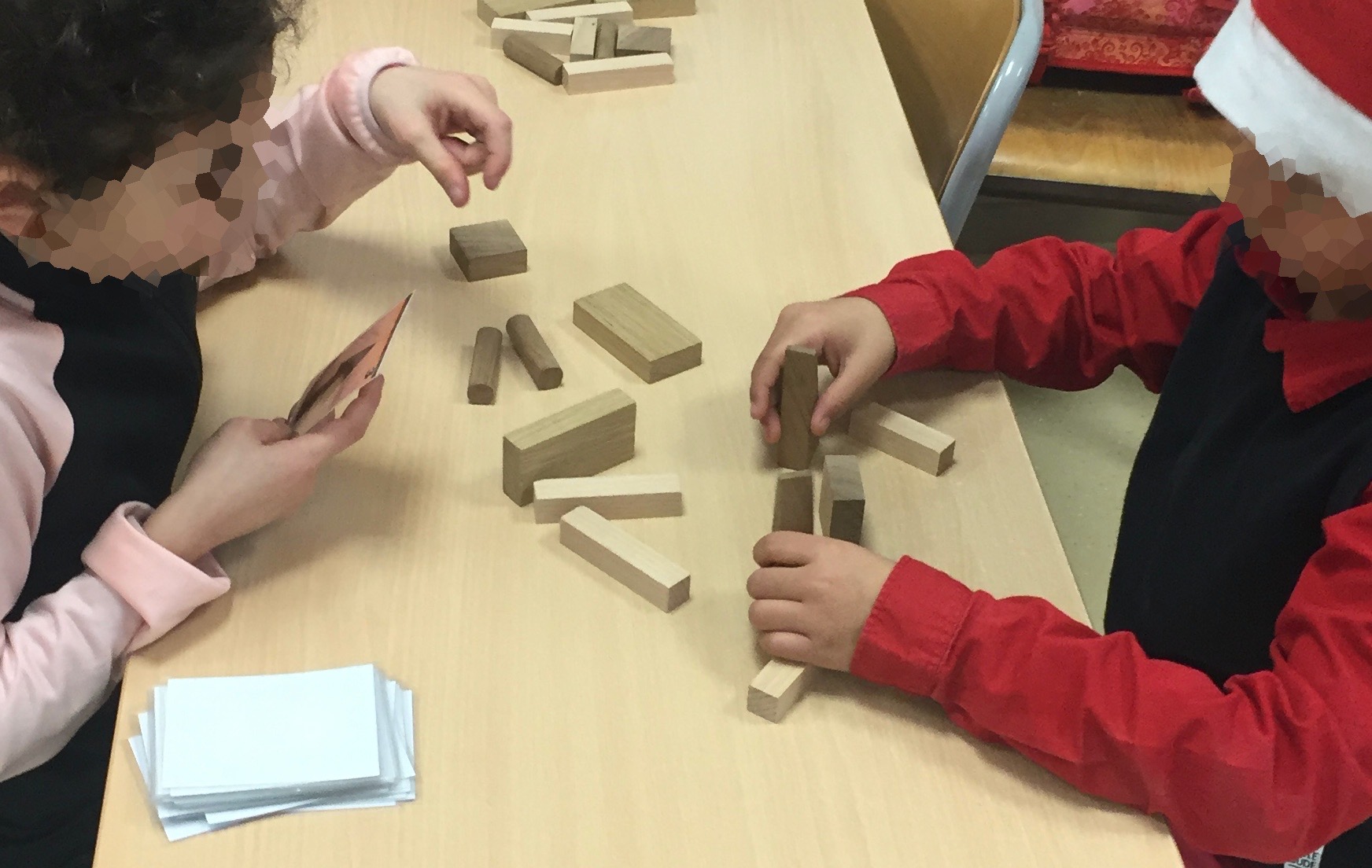 Par équipe, dont le manipulateur a les yeux bandés, les enfants ont à reproduire en 3 dimensions une structure géométrique avec des éléments de bois.